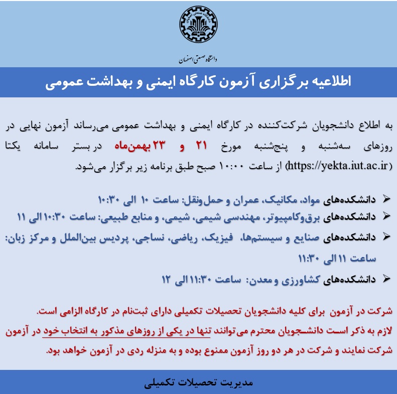 زمان برگزاری آزمون کارگاه ایمنی و بهداشت عمومی